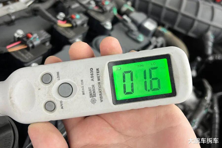 测试方法:水温正常后,关掉空调,在怠速状态下,使用测振仪垂直曲轴方向,将探针接触发动机金属机体中间的最高位置,测量发动机振动加速度值,数值越低,表明振动越小。