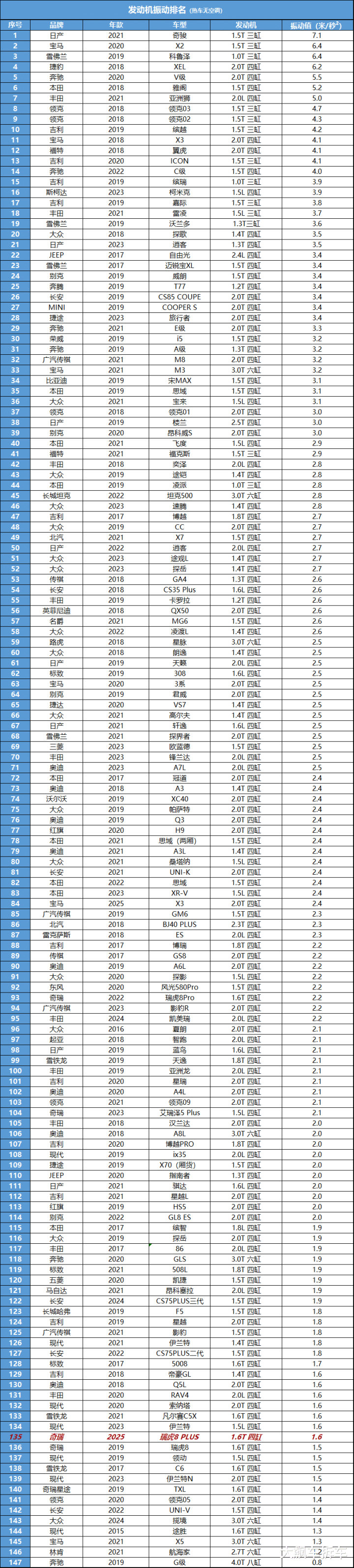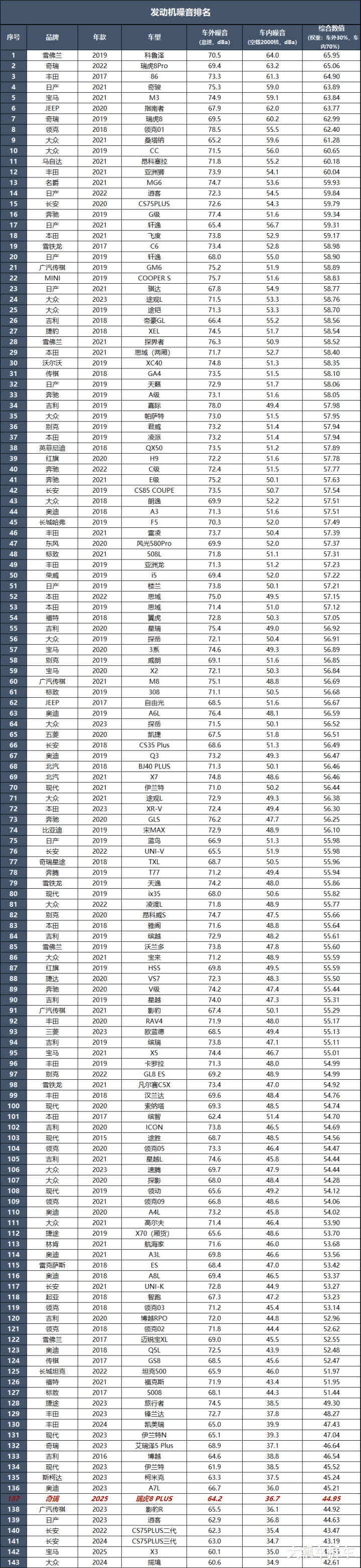 测试方法:发动机完全热机,水温正常,关闭空调,正常怠速下进行测试;打开发动机盖、取下引擎罩,在距离发动机机体上方20厘米处,进行噪音采集,取平均值,为车外发动机噪音数值(dBa);在车内,将车窗关闭,发动机空载运转2000转/分,将噪音仪置于方向盘正上方,取平均值,为车内发动机噪音(dBa)数值。并且以车内30%,车外70%的权重进行综合计算。