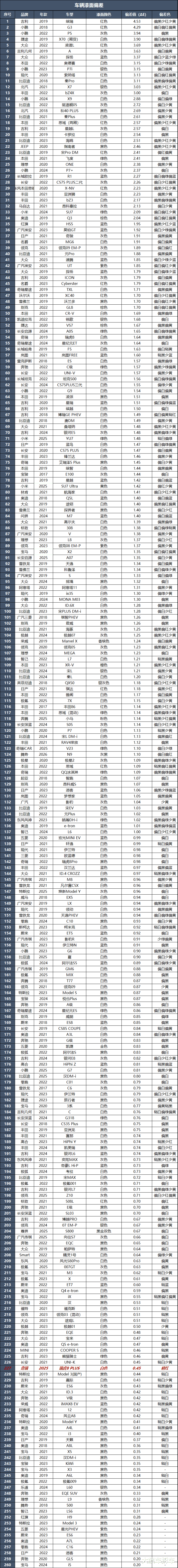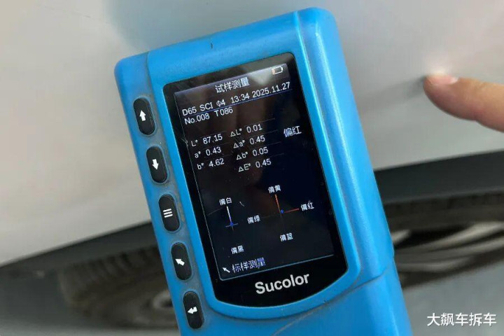 经过测试,最大色差值位于前保险杠处,色差值为0.45ΔE,比基准点偏红。从数值上来看,这辆车的喷漆工艺质量控制得真不错。